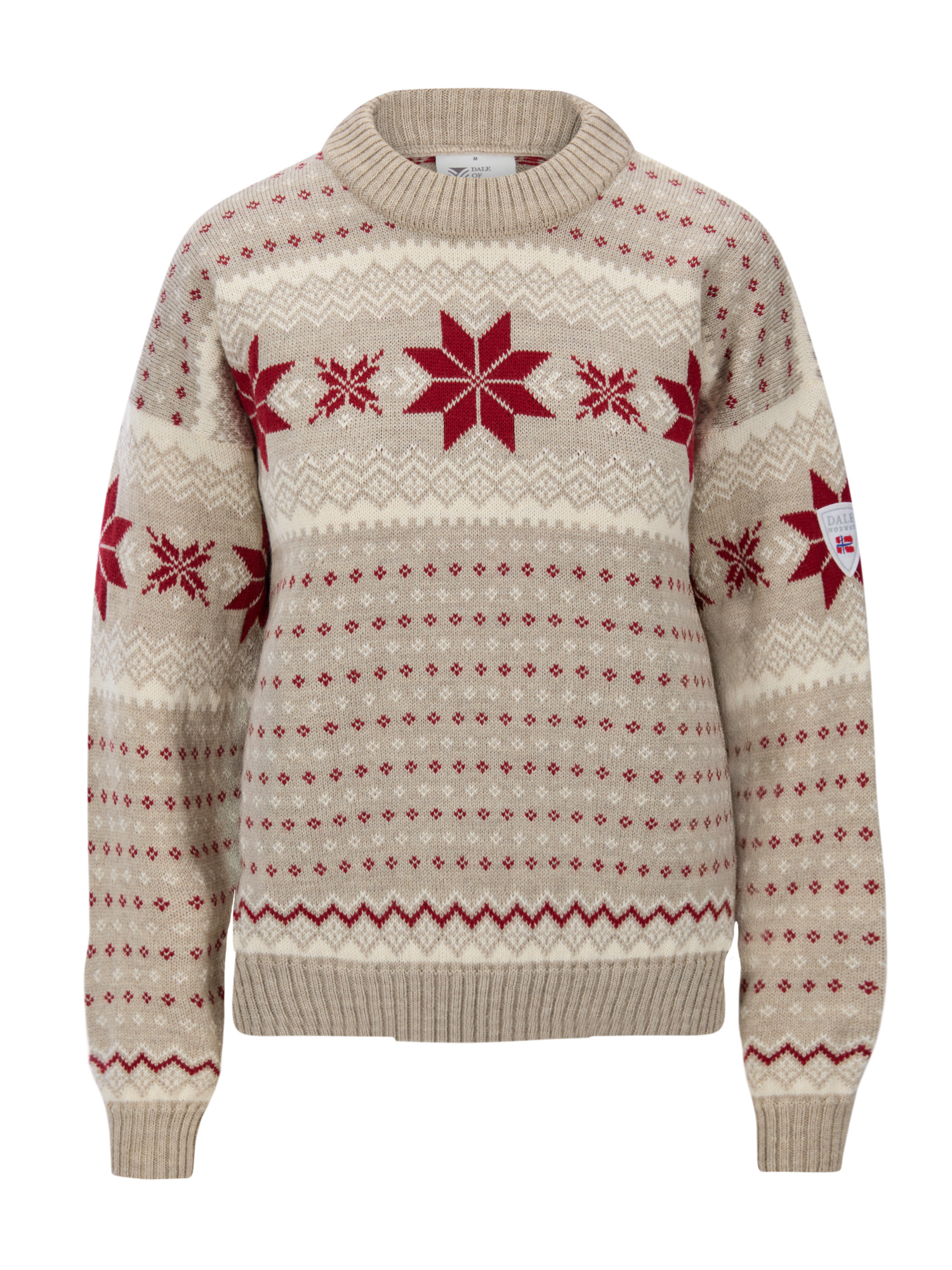 The design features Dale of Norway’s iconic eight-petal rose paired with a subtle lice pattern, creating texture and visual rhythm across the knit. The balance of bold motifs and finer details gives the sweater a festive yet composed expression, rooted in Norwegian knitwear tradition. Ideal for cold winter days, holiday gatherings, and relaxed après-ski moments.