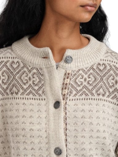 The Hannah cardigan is an elegant button-down knit that combines vintage heritage with modern flair. Featuring exposed buttons on the ribbed placket and a relaxed fit with a T-sleeve insert, this cardigan is effortlessly stylish and comfortable. Heavily inspired by a cardigan first introduced in 1978, its design has been lovingly brought back to our Dale universe, capturing the essence of timeless fashion with a nod to our origins. Finished with Norwegian-made pewter buttons, each detail celebrates authentic craftsmanship and the rich history of Dale of Norway. While colorway A00 is made from 100% long-lasting Norwegian wool, colorway M00 is made from premium undyed lightweight wool, utilizing the natural colors of the animal fiber. This approach not only highlights the beauty of the wool in its most authentic form but also preserves its natural qualities by eliminating the dyeing process, resulting in a garment that is as natural as it is stylish. - XS - XL