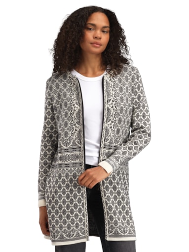 • A long and comfortable jacket. Detailed patterns and side slits add the perfect amount of femininity to this elegant piece. Made with 100% soft and lightweight merino wool in a long-lasting knitting quality.