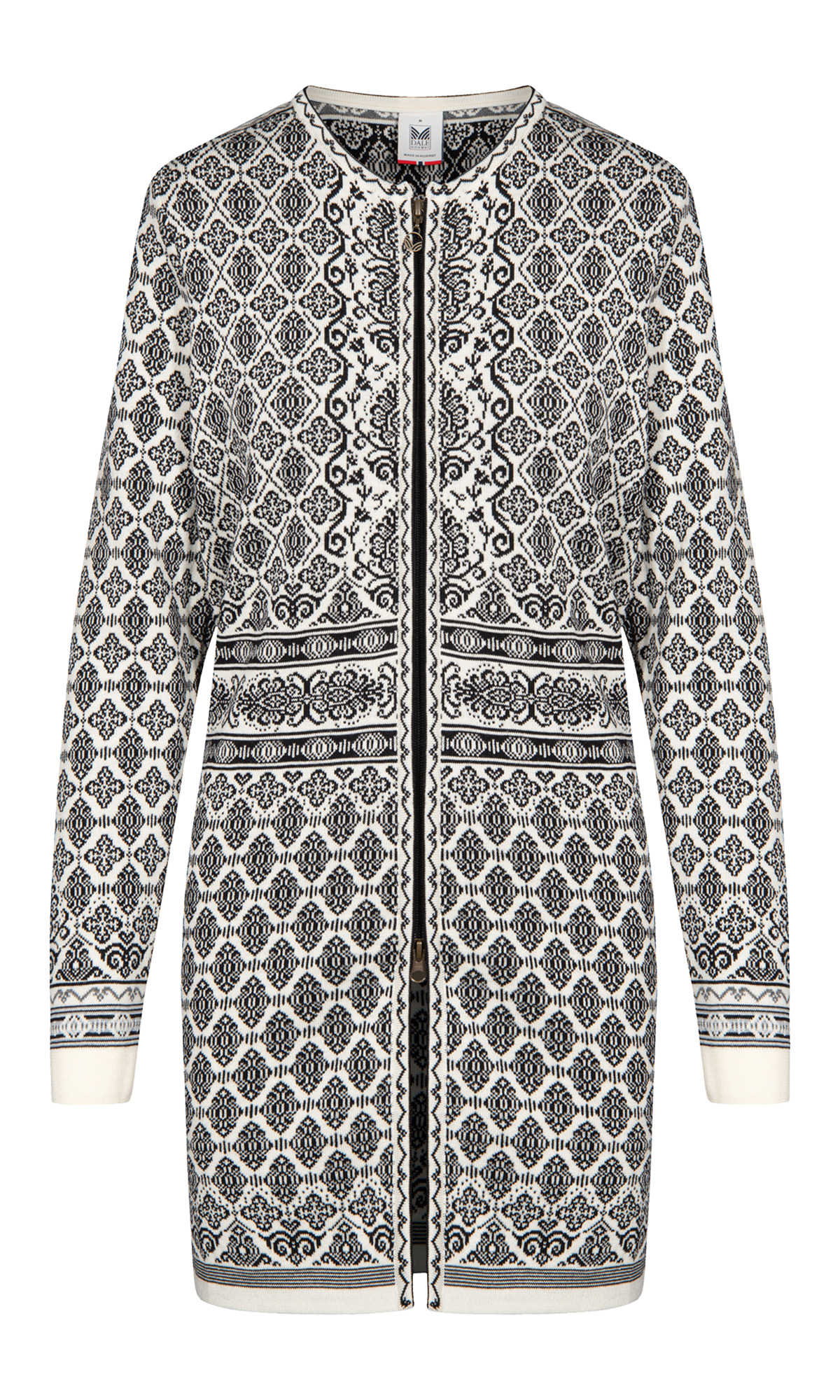 A long and comfortable jacket. Detailed patterns and side slits add the perfect amount of femininity to this elegant piece. Made with 100% soft and lightweight merino wool in a long-lasting knitting quality.