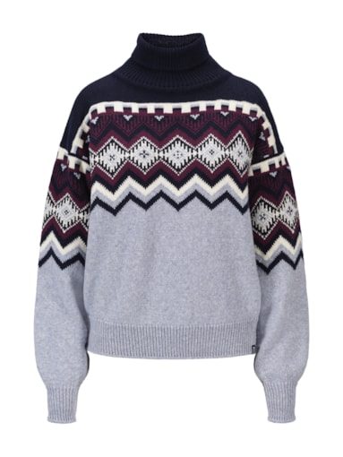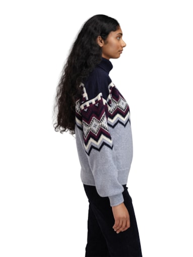 A super-soft merino sweater featuring a comfortable high neck and intricate pattern details in a mix of contrasting colors. The sweater is slightly cropped, with voluminous sleeves and a relaxed fit. It has chunky ribbed finishes at the cuffs, neckline, and bottom hem. Inspired by classic ski sweaters, the pattern is a reimagined version of our bestselling Vilja sweater.