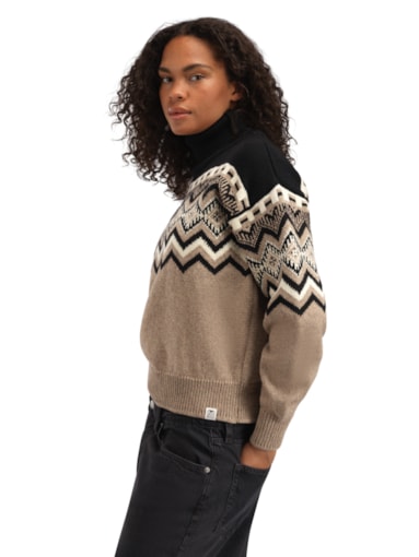 A super-soft merino sweater featuring a comfortable high neck and intricate pattern details in a mix of contrasting colors. The sweater is slightly cropped, with voluminous sleeves and a relaxed fit. It has chunky ribbed finishes at the cuffs, neckline, and bottom hem. Inspired by classic ski sweaters, the pattern is a reimagined version of our bestselling Vilja sweater.