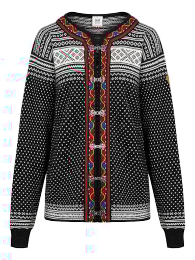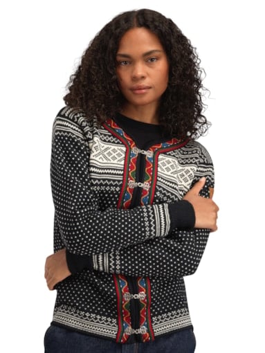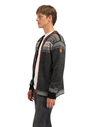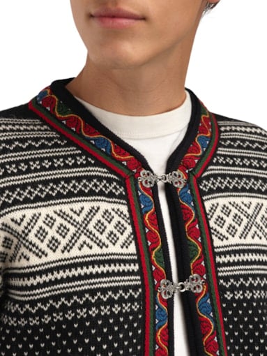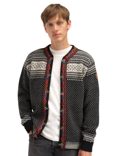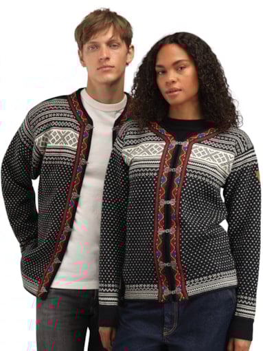 The Setesdal design is Norway’s most famous pattern. This is the original "lusekofte," knitted in 100% wool, with Norwegian-made pewter clasps and woven bands, identical to the original design. The wool jacket features the well-known "luse" pattern and traditional crosses, which were originally knitted in to protect against evil spirits. The Setesdal jacket in the beige colorway (M00) is made from 100% premium undyed lightweight wool, utilizing the natural colors of the animal fiber with unique shades ranging from darker to lighter tones. This approach not only highlights the beauty of the wool in its most authentic form but also preserves its natural qualities by eliminating the dyeing process, resulting in a garment that is as natural as it is stylish. The Setesdal jacket in off white and black colorways (A and F) are made of 100% Norwegian wool, which is known for its warmth, breathability, and durability. The Norwegian wool comes from sheep that have adapted to the challenging weather conditions in Norway, and the fibers are especially well-suited for regulating body temperature and protecting against the cold. The wool is naturally moisture-wicking and has a unique ability to insulate. Norwegian wool is an important element in preserving traditional Norwegian craftsmanship, and the wool used in the Setesdal jacket is carefully selected to ensure high quality and durability. This unisex garment is made with measurements corresponding our men’s sizes. For women’s sizes we recommend selecting one size smaller than your usual size. · XS – XXXL · Regular fit · Mid layer, heavy knit · Color M00: 100% undyed lightweight wool (Nature Undyed 27 micron) · Color A and F: 100% long-lasting Norwegian wool (Plover 33.5 micron) · 3-ply · 5 gauge · 1070g (size L) · T-sleeve · Crew neck with front clasp opening · Norwegian-made pewter clasps · Designed and knitted in Norway · Hand wash only