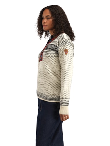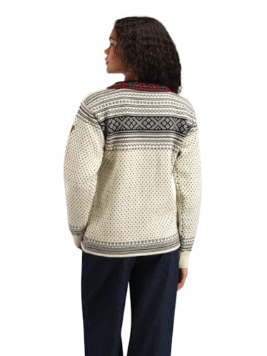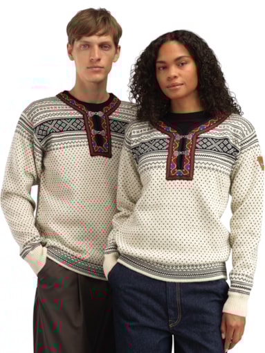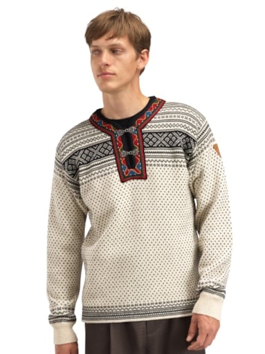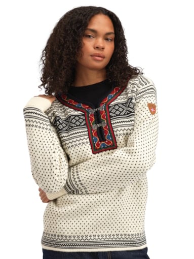 The Setesdal design is Norway’s most famous pattern. This is the original "lusekofte," knitted in 100% Norwegian wool, with Norwegian-made pewter clasps and woven bands, identical to the original design. The wool sweater features the well-known "luse" pattern and traditional crosses, which were originally knitted in to protect against evil spirits.