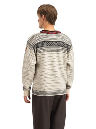 The Setesdal sweater in the beige colorway (M00) is made from 100% premium undyed lightweight wool, utilizing the natural colors of the animal fiber with unique shades ranging from darker to lighter tones. This approach not only highlights the beauty of the wool in its most authentic form but also preserves its natural qualities by eliminating the dyeing process, resulting in a garment that is as natural as it is stylish.