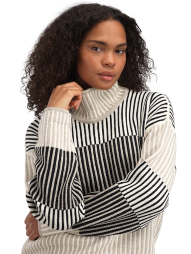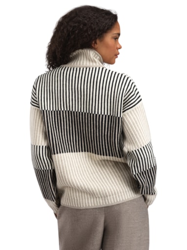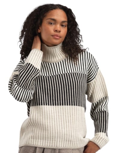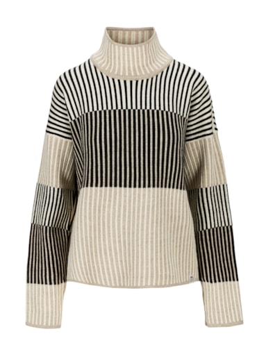 • A playful sweater with a relaxed, dropped shoulder giving a wide fit. The sweater is knitted in a tonal palette and a structured effect giving a rib look-a-like. Despite the split look, the front, back and sleeves of the sweater are knitted as whole pieces. The high neck is single knitted with a wide shape for comfort and room.