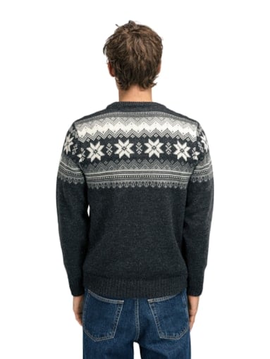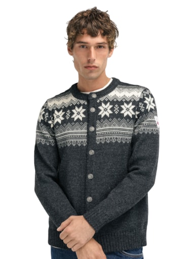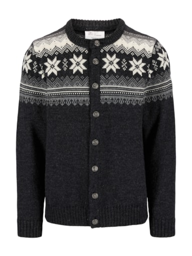 A classic, retro wool jacket with detailed patterns reminiscing back to the 1950s and 60s. The jacket has a front button closure with Norwegian-made pewter buttons. The Veafjord is knitted in 100% long-lasting Norwegian wool, making the wool jacket extra warm and durable. - Fit: regular