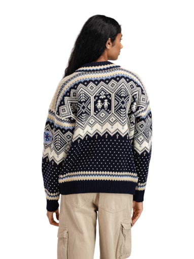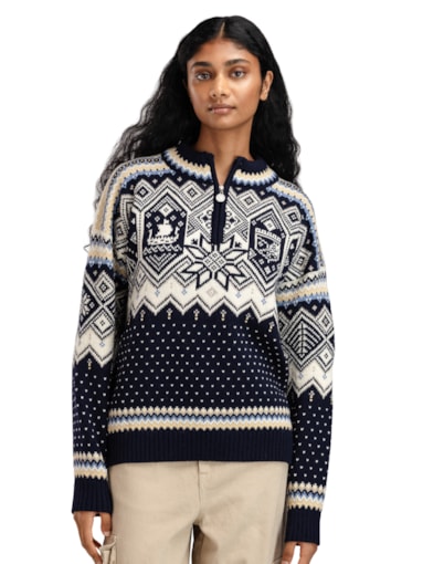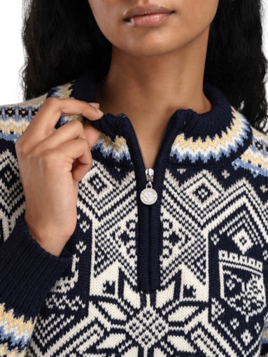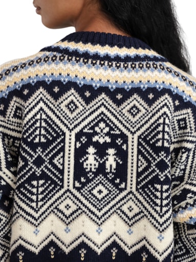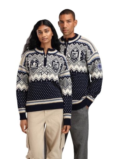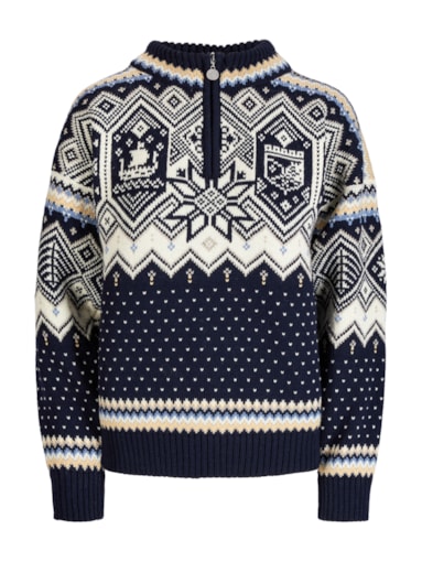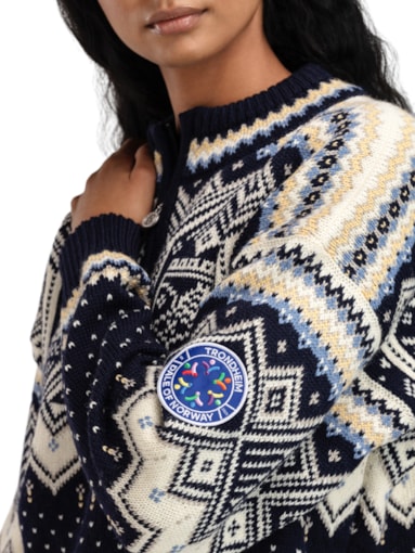 This is the official sweater for the 2025 Ski World Championships in Trondheim. A warm and comfortable wool sweater with a distinct retro touch, blending fresh colors with a classic expression. The pattern is inspired by the championship's values of diversity and inclusion, while drawing motifs from historical cultural landmarks in Trondheim. The sweater is knitted in 100% wool for long-lasting qualities and features a medium-high neck with a zipper: - Fit: loose